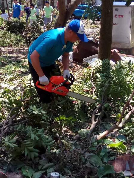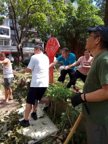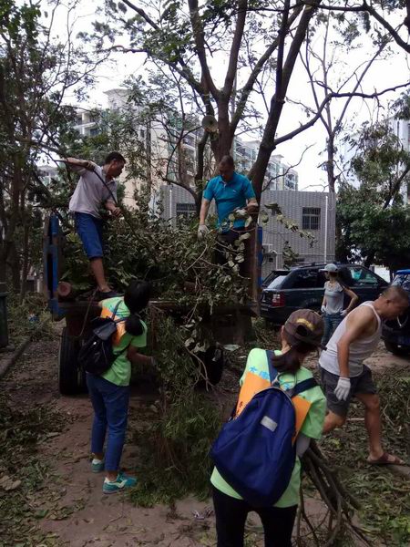 但災(zāi)難打不倒樂(lè)觀的廣東人,臺(tái)風(fēng)過(guò)后,人們立即行動(dòng)起來(lái),積極投入到恢復(fù)重建當(dāng)中。26日,是風(fēng)災(zāi)過(guò)后第一個(gè)周六,不少珠海人自發(fā)地走上街頭,加入義工隊(duì)伍,親身參與城市清理工作,打通道路,恢復(fù)交通。
